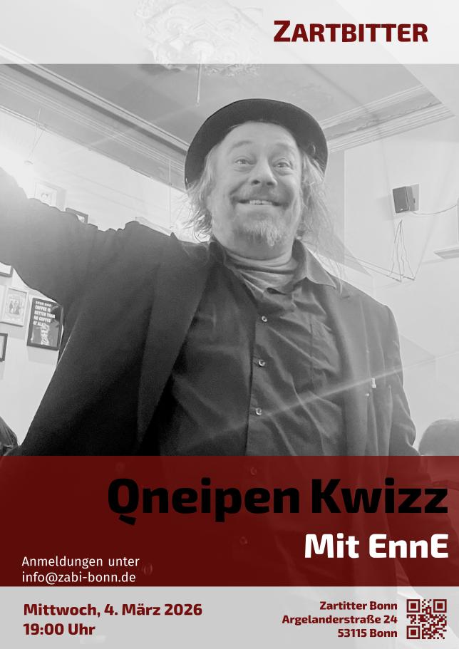 Am Mittwochabend, den 4. März 26, ist ab 19:00 Uhr wieder Qneipen-Kwizz im ZaBi. Das Thema lautet dieses mal «Schwarzweißgrau schattiert». Das Kwizz ist schon voll und es sind leider keine Anmeldungen mehr möglich.